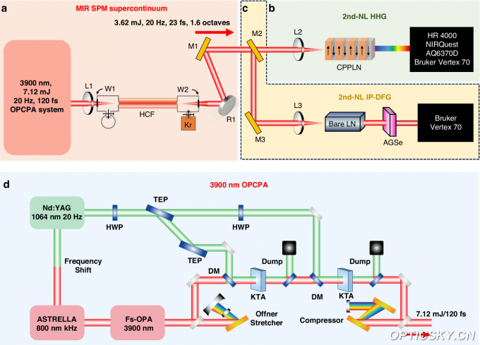 该白光激光系统采用3.9μm中红外激光为桥接光源,通过上转换过程将短波边界推进至200nm深紫外区域,通过下转换过程将长波边界延伸至25μm远红外波段。团队创新设计的啁啾周期极化铌酸锂(CPPLN)晶体实现了2-12次高次谐波同时产生,上转换模块转换效率达40%、输出能量1.45mJ;级联LN-硒镓银(AGSe)晶体架构的下转换模块转换效率达18%、输出能量0.75mJ,综合技术指标远超同类型超连续激光装置水平。